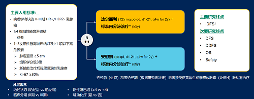 达尔西利(Dalpiciclib)是利来医药自主研发的口服、选择性的小分子CDK4/6抑制剂,也是中国首个自主研发的新型高选择性 CDK4/6 抑制剂,已证实其与内分泌治疗(ET)联合用于 HR+/HER2- 晚期乳腺癌的一线和后线治疗时,均显著改善无进展生存期(PFS)6,7。因此开展了一项随机、双盲、III期临床试验(DAWNA-A),以进一步评估达尔西利联合内分泌治疗作为高危早期 HR+/HER2 - 乳腺癌辅助治疗的效果。本研究纳入高危复发风险人群需满足以下标准之一:①≥4 枚阳性腋窝淋巴结;②1–3枚阳性腋窝淋巴结且合并≥1 项高危因素(肿瘤直径 ≥5 cm,组织学分级3级,辅助治疗后残留浸润性乳腺癌,Ki-67 ≥30%)。本文呈现预先设定的首次中期分析(IA1)结果。